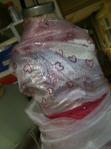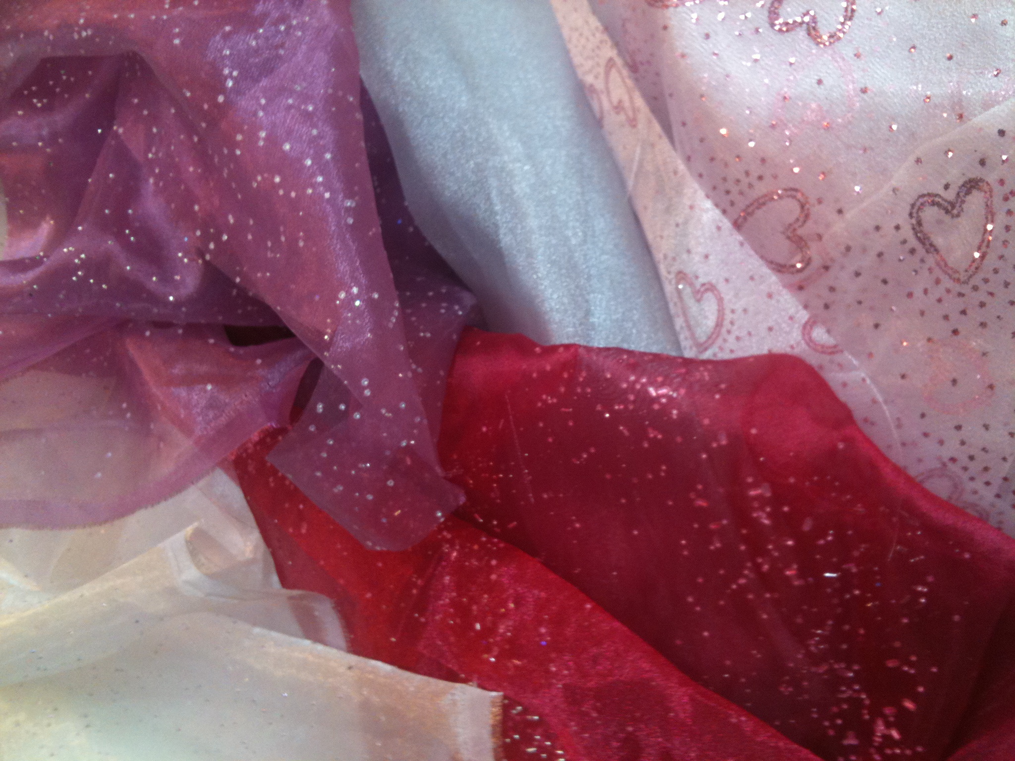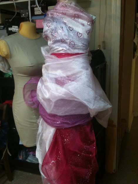 As for fabric choices, I had a huge selection of various fabric colors and remnants to choose from. I scoured and dug through bins to find the most sparkly, girly fabrics I could. There was organza, tulle, chiffon, an assortment of knits. It was every designers dream: the fabric store had come to me! It took some time to come up with the perfect combination of pinks, but I finally narrowed it down to these: