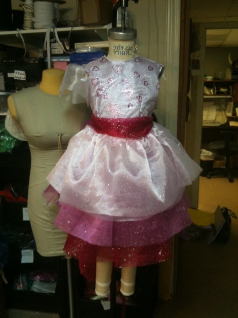 At this point, I decided to step away from the project and revisit it the next day. It’s always a good idea to step away from something when you’ve been staring at it for such a long time- I was starting to go cross-eyed! So, the next day I came prepared to put the finishing touches on the dress for the last 2.5 hours. These details included hemming the ruffles, putting in a zipper and gathering the sleeves, as well as other little details that take longer then expected. The last 20 min of the project were VERY intense, but I pulled it off to the point of it being ‘runway ready’. I didn’t have time to make the removable skirt, or the heart belt, but I did achieve the pink rainbow look, which was more the enough to satisfy the little princess. She could not WAIT to try it on and show her Daddy! Here is a picture of the final product: