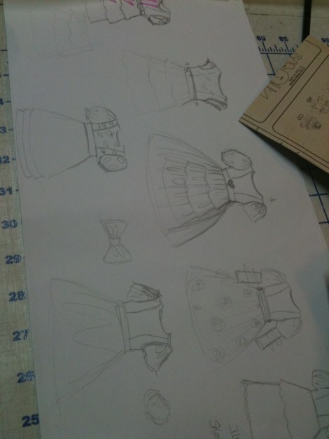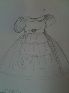 After deciding on a final design (pictured to the left), I came up with a concept that I knew would be a challenge to complete given my alloted time. Let’s just say that I knew this was going to be a rough sketch. I’d have to play it by ear and see how it turns out. In the sketch you can see tiered layers of fabric under a larger, fuller skirt (which I hoped to make full length and detachable).