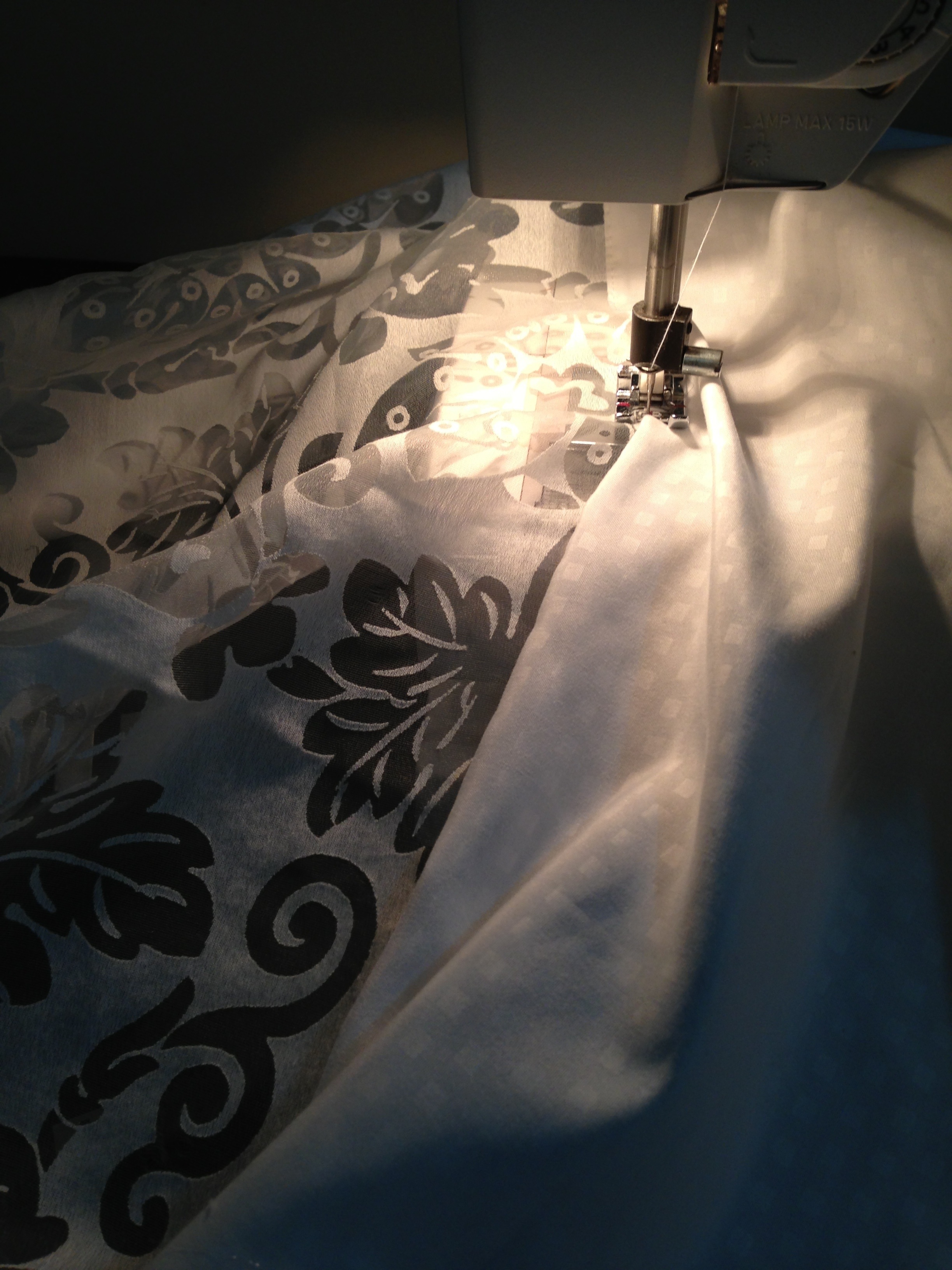 I purchased a fabric shower curtain liner from Kmart for $12 a while back and since I had already planned on hanging it from the ceiling I knew it wouldn’t be long enough to reach the tub. My snooty self doesn’t like mildew covered plastic curtain liners sticking to my body when I’m trying to get clean. I decided to put in a horizontal sheer panel to lengthen the liner. I’ve seen them at hotels and I figured it would help let more light into the shower. I decided to use as a curtain, sheers I had hanging else wear temporarily. I hemmed them and modified the liner with the excess to match. The sheers made the liner look polished and elegant. To finish it off, I added a valance.