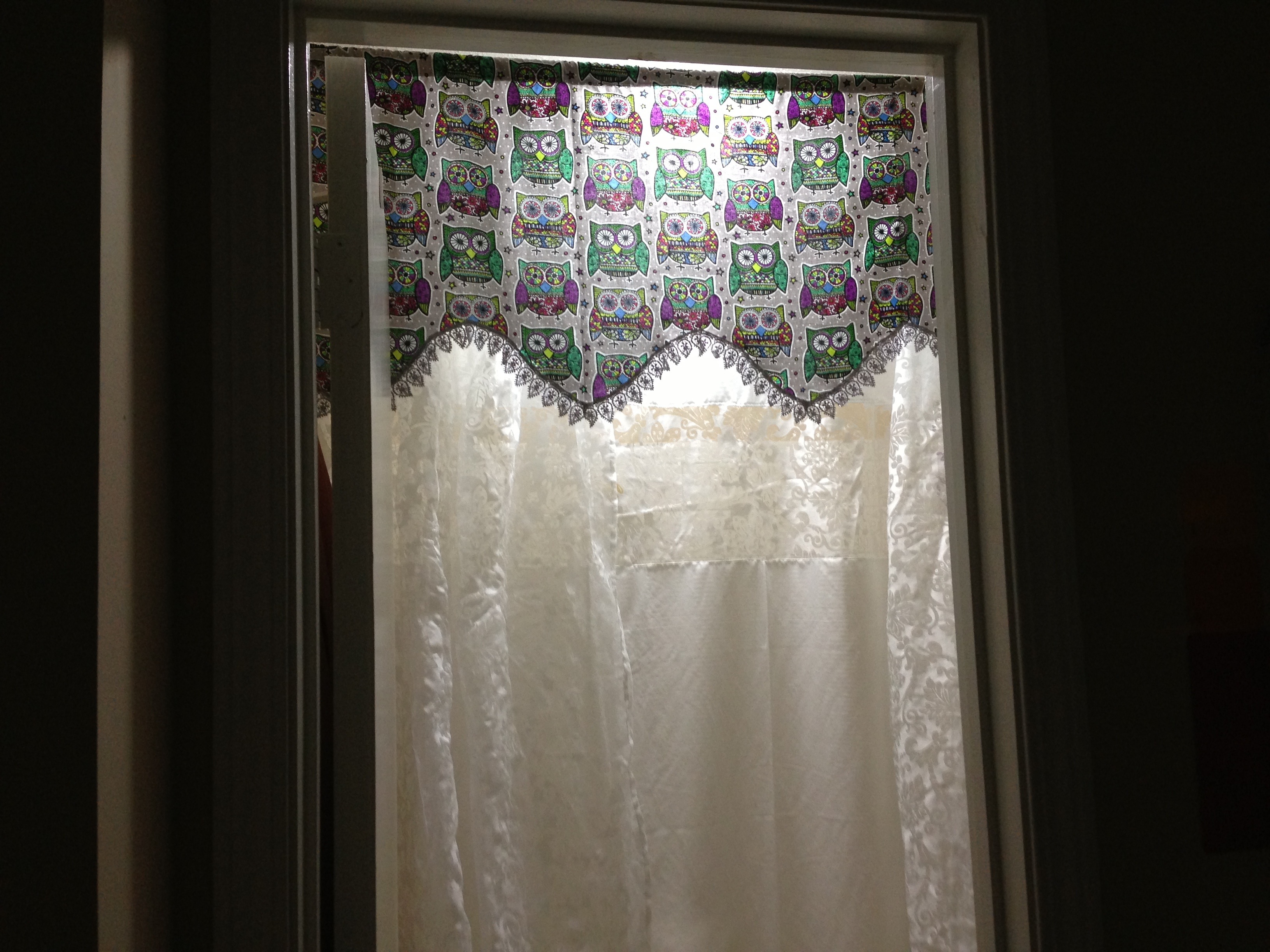 The owl fabric was purchased for $10 at Joann Fabrics. It is one of their exclusive prints for this season. I instantly fell in love with the jewel toned owls and neutral gray background. The polka dots coordinate perfectly with the sheers. I had some trim laying around that was purchased on a supply excursion in Central America. I commend myself for purchasing 4 yards of it when I was there. I still have a little left. And a bit of the owl fabric. Maybe I’ll make myself a matching knee pillow for when I bathe little Miss.