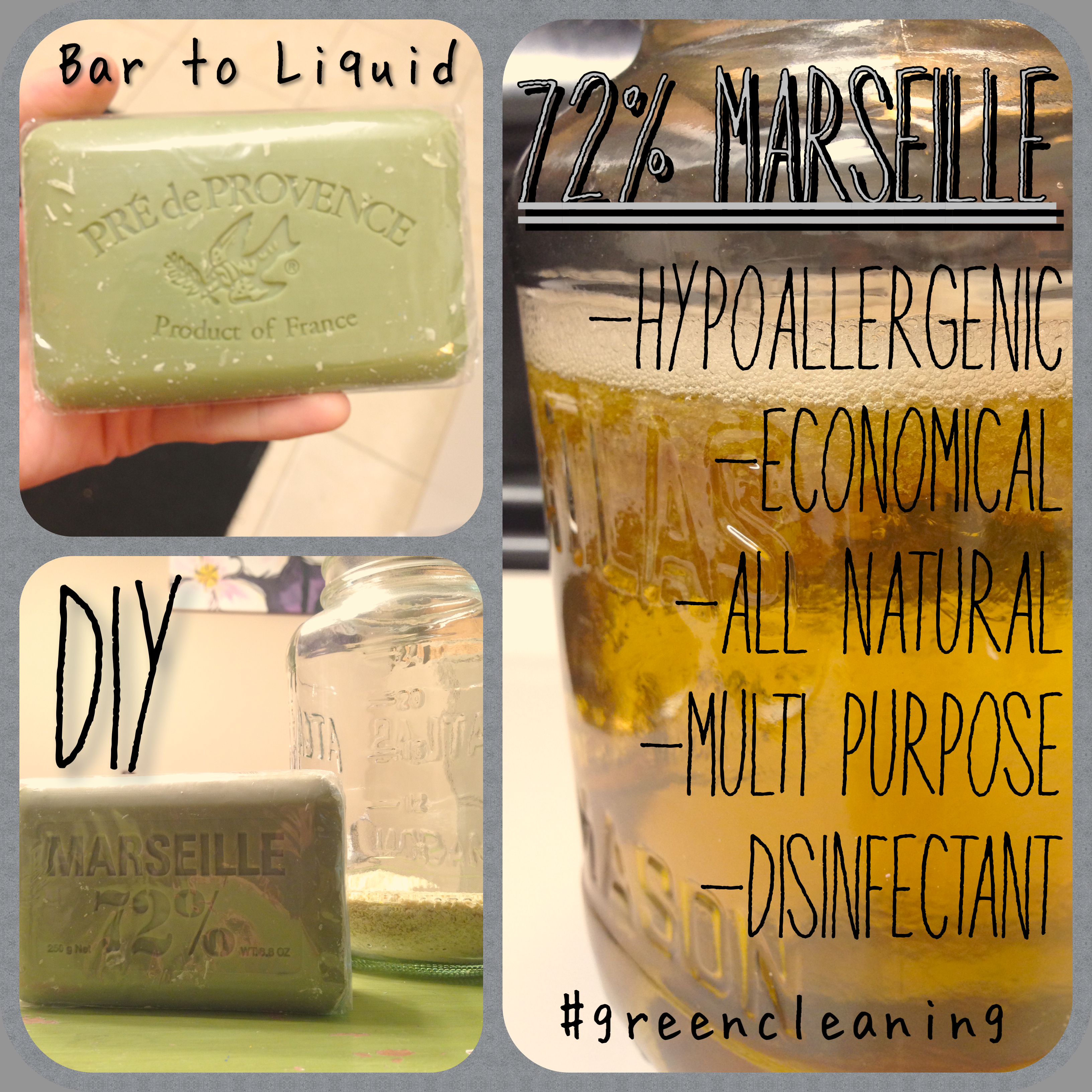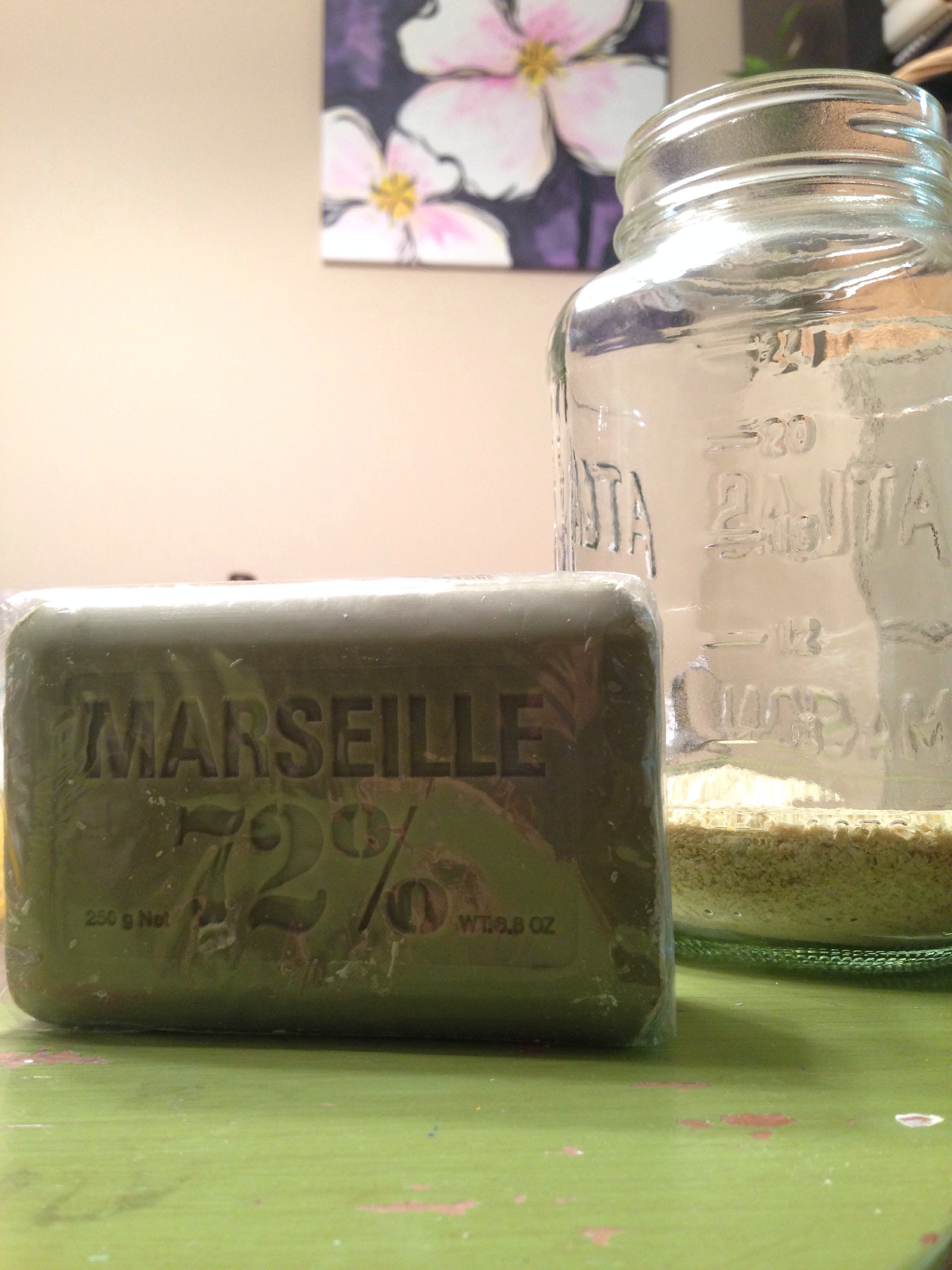 Since the birth of my daughter, I started looking at all the products in my home- all those ingredients I cannot even pronounce. Not to mention the artificial dyes and perfumes! I began to do my research online for some recipes on how I can make my own toxic free products and many of them boasted about the magical liquid Castile soap known as Dr. Bronners. They come in many luscious scents and you can use it straight out of the bottle or dilute it to clean just about anything. But, purchasing a $12-15 bottle of soap doesn’t fit into my budget right now, and I already have this bar of Marseille that I used to make my homemade Laundry detergent. I started using it as a detergent booster, grating it into to the laundry detergent I was already using in my wash. I knew I could use it for so many other things, though. [For more information on the chemicals found in laundry soap, read this article by Dr. Mercola. There is a broken link to a recipe for home made detergent at the bottom on the page. I found a great recipe here.] I will get MY laundry detergent recipe published soon, and I will be sure to update my readers when I do.
