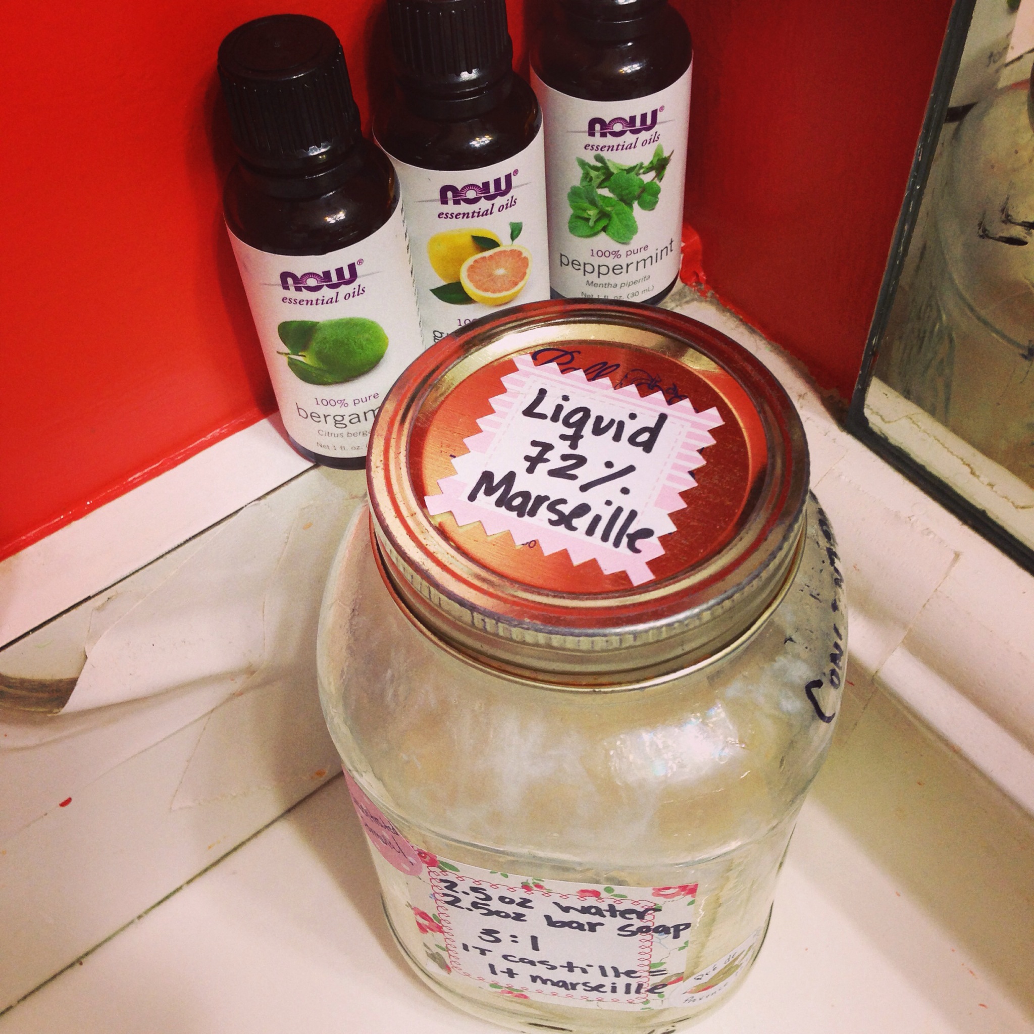 NOTE: After trial and error, I’ve discovered that the recipe is triple the concentration of Dr. Bronners. That means, when a recipe asks for 1 Tbsp Dr. Bronners, you use 1 tsp of this liquid. 2 Tbsp Dr. Bronners, use 2 tsp of liquid marseille, and so on.
