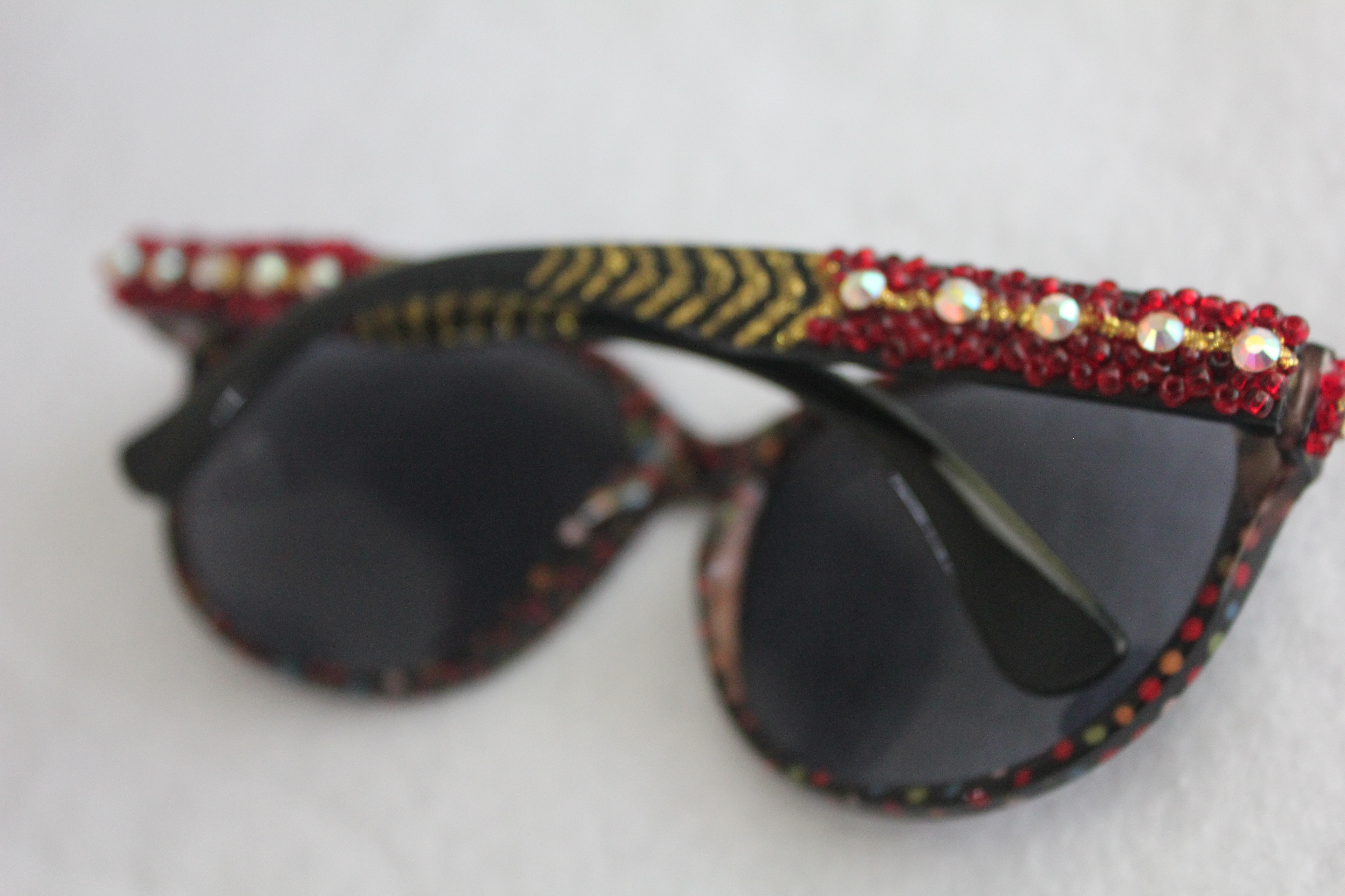 The red beads on the temple of this pair are made of glass, and are further embellished with Swarovski crystals and gold glitter paint. The front has little multicolored polka dots. This pair is very similar to the ones I made myself, which I plan on featuring a DIY on very soon. I get TONS of compliments on them.