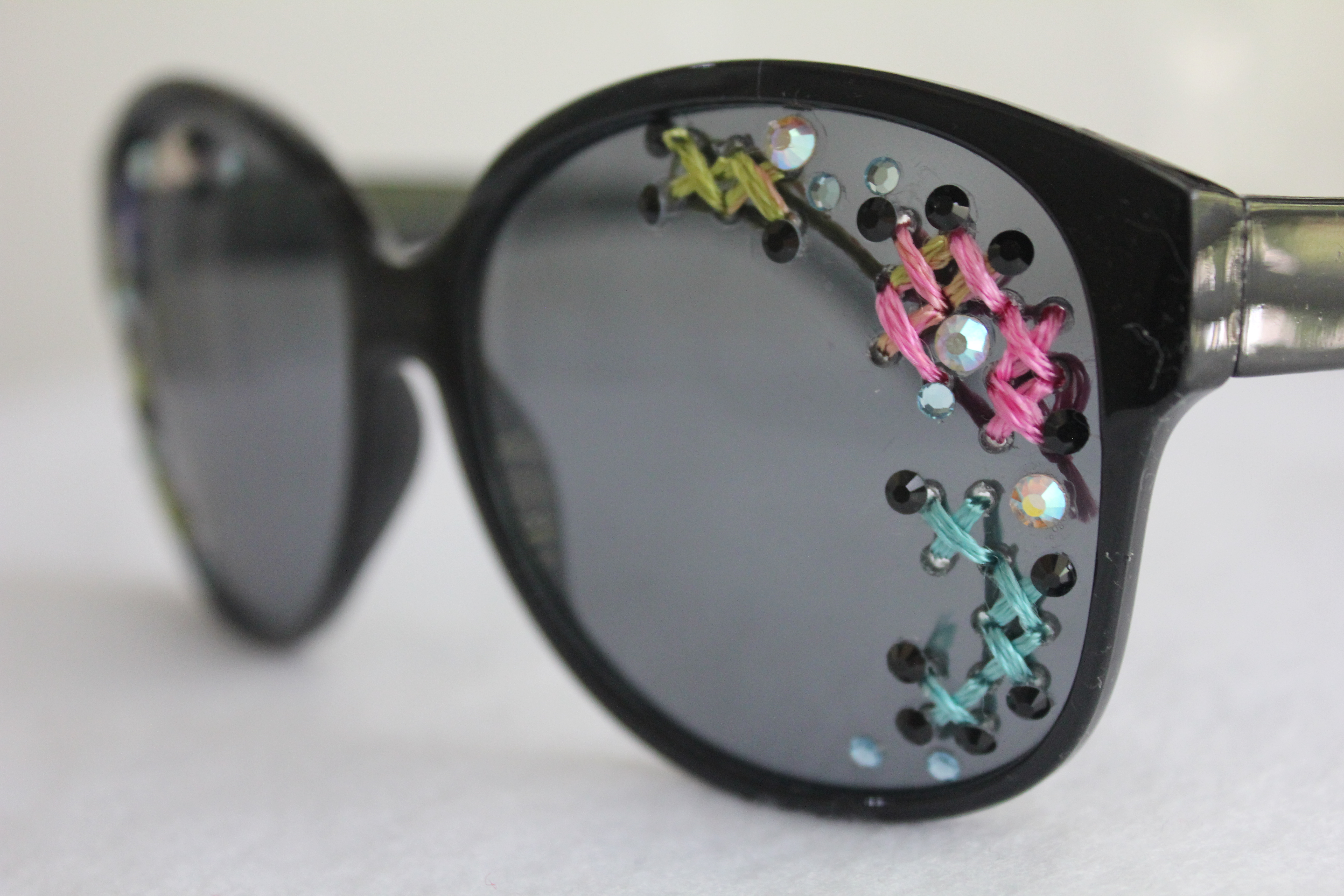 New this week in my shop: you will find two pairs of couture designer inspired sunglasses, embellished by yours truly. Guess who got stuck modeling them? Yup. The pictures turned out better than expected considering I had to operate the camera, too. Sans remote, I might add. Click the photos to see the full listings. Here are some of my favorite product shots: